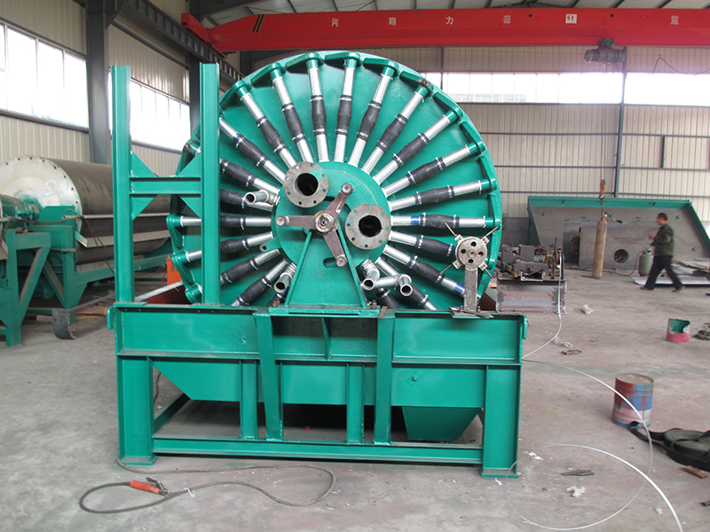 筒體內部裝有鍶鐵氧體永久磁系,可促使磁性顆粒迅速吸附到濾布表面,由于是上部給料,使得濾餅中精礦按粒度分層的效果更加明顯,當磁性精礦形成濾餅時,顆粒同時受到重力和磁力的作用,粗顆粒精礦比細顆粒精礦向濾布運動的快,精粒首先接觸濾布,故濾餅的透氣性好,而且礦漿中磁性顆粒在磁力吸引下呈放射狀布于圓筒表面,并由于磁系極性變化而產生磁攪動作用,這都成為濾餅易脫水的有利條件,使得濾餅厚且透氣性好,顯著地提高了生產率,與同規格的筒形真空過濾機相比,其效率提高三倍以上。